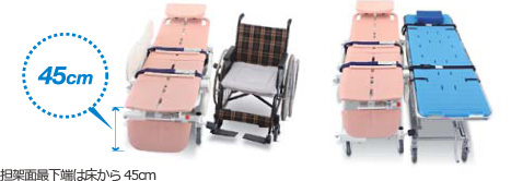 介助者の“のせかえ” 作業の負担を軽減するために、開閉機構を備えた大型サイドフェンスと足受けを採用しました。 “のせかえ”時には、担架と運送ストレッチャーの間は隙間なく横付けができるので、“のせかえ”も最短距離で行えます。