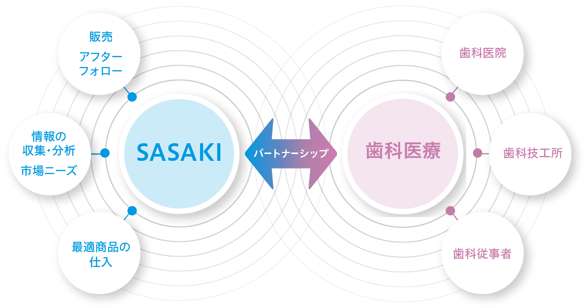 歯科機器・器材・薬品等の販売を中心に、治療や商品に関する情報の提供、新規開業や移転開業等のサポートなど、よりよい歯科医院づくりのお手伝いをさせていただくことは、ササキ株式会社が最も大切にしている使命です。