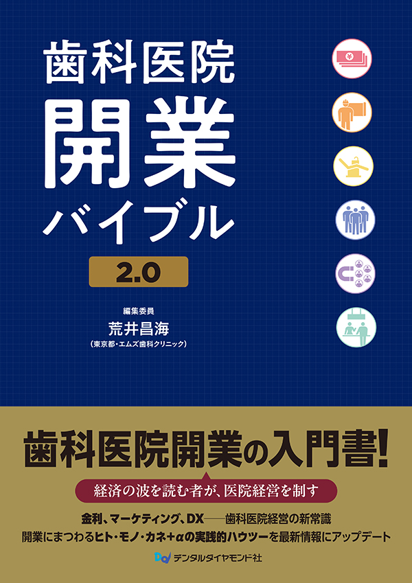 歯科医院開業の入門書として多くの先生方にご愛読いただいた『歯科医院開業バイブル』が、報を全面的に更新し、装いも新たに登場。多くの歯科医師が通る道ですが、開業医になると勤務医時代と比べはるかに多くの役割を担わなければならない現実に直面します。そこで本書では、「資金繰り」「事業計画」「医院設計」「求人・採用」「ブランディング」「法規制・行政手続き」に加えて、院長として成功するための「マインドセット」など、開業に際し知っておくべき情報を、各分野のエキスパートが解説しています。本書は、コロナ禍を経て経済状況が大きく変化した現代において、初めての開業に悩む先生方が知っておくべき、押さえておくべきポイントが整理された実践的ハウツー本です。近い将来の開業に備えて、ぜひお役立てください!