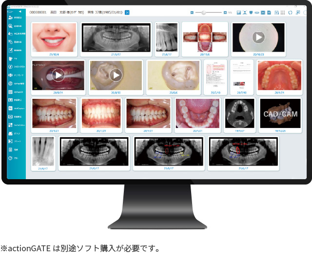 ネクストビジョンで撮影した静止画や動画は、一元管理システム「action GATE SYSTEM(アクションゲートシステム)」と連携し、患者さんごとにまとめて表示が可能です。様々なソフトを開くことなく一画面で完結するので、診療業務全体の効率化が可能です。