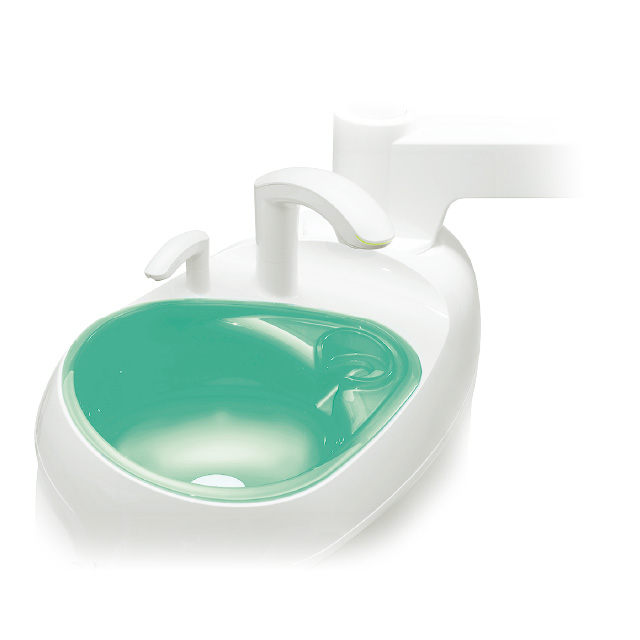体をスピットンに寄せやすい、滑らかなカーブを描くデザインです。患者さんは自然な姿勢でうがいすることができます。