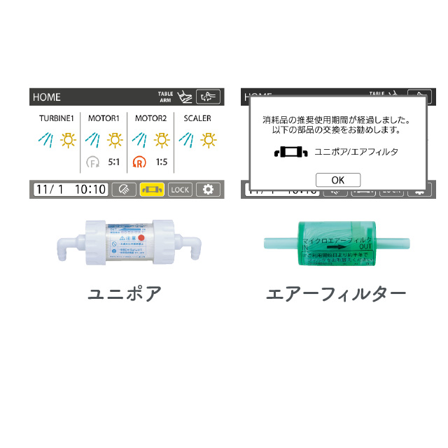「ユニポア」と「エアーフィルター」の交換時期を液晶タッチパネルでお知らせします。