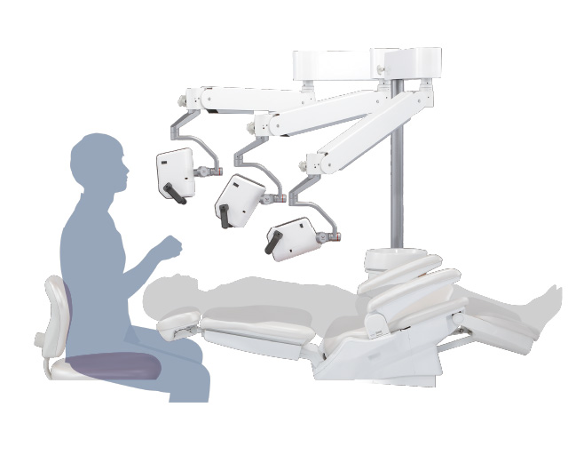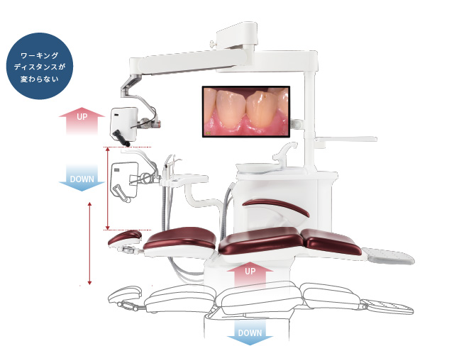 3軸アーム採用でマルチアングル撮影が可能3軸アームによる自由な位置付けが可能なため、術者の姿勢を崩すことなく、ミラーを使わなくても観察しやすい部位が多くなります。チェアマウントタイプのネクストビジョンなのでチェアがどの高さでも一定のワーキングディスタンスが確保できます。
