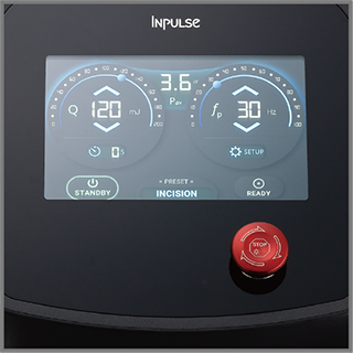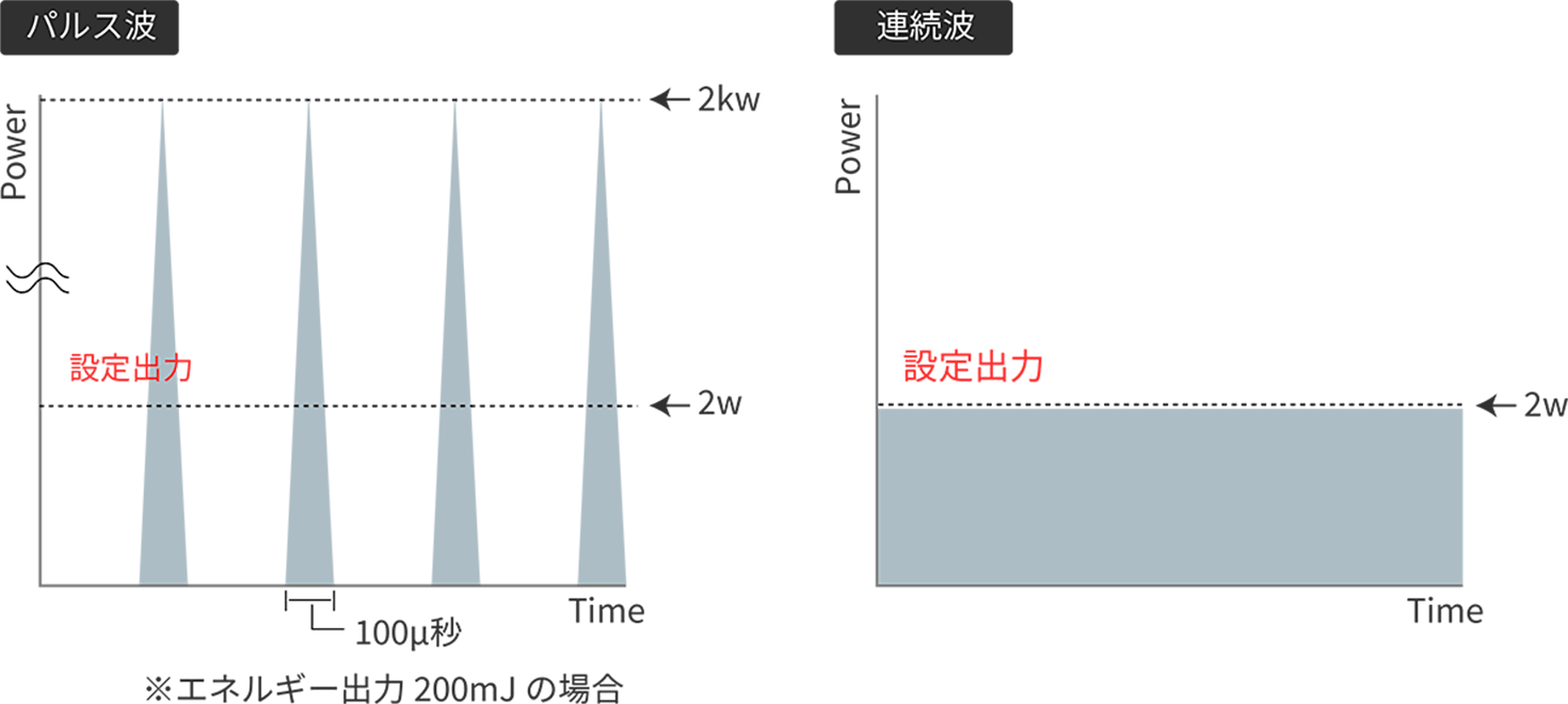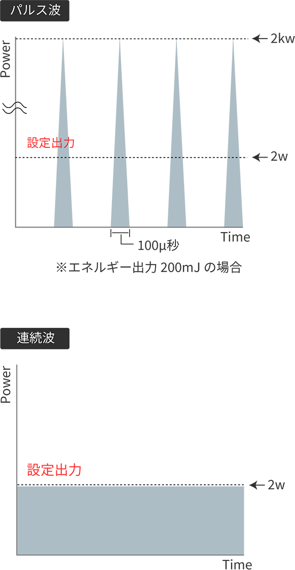 インパルスデンタルレーザーのパルス発振システムでは1 パルスあたりの照射時間は様々な種類のレーザーの中でも非常に短時間の照射を可能にしています。1パルスあたりの照射時間は1/10,000 秒‒1 マイクロ秒(繰り返しパルス-Hz)。このパルスの発振回数(5Hz~100Hz毎秒)と1パルスあたりのエネルギー(ミリ・ジュール-mJ)量(20mJ~200mJ)を組み合わせることで、症例に合わせた最適な設定で治療を行えます。