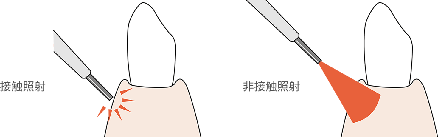 インパルスデンタルレーザーは水分に作用を阻害されることが少なく、接触法および非接触法の使い分けで硬組織と軟組織が複雑に絡み合った口腔内での治療に最適です。