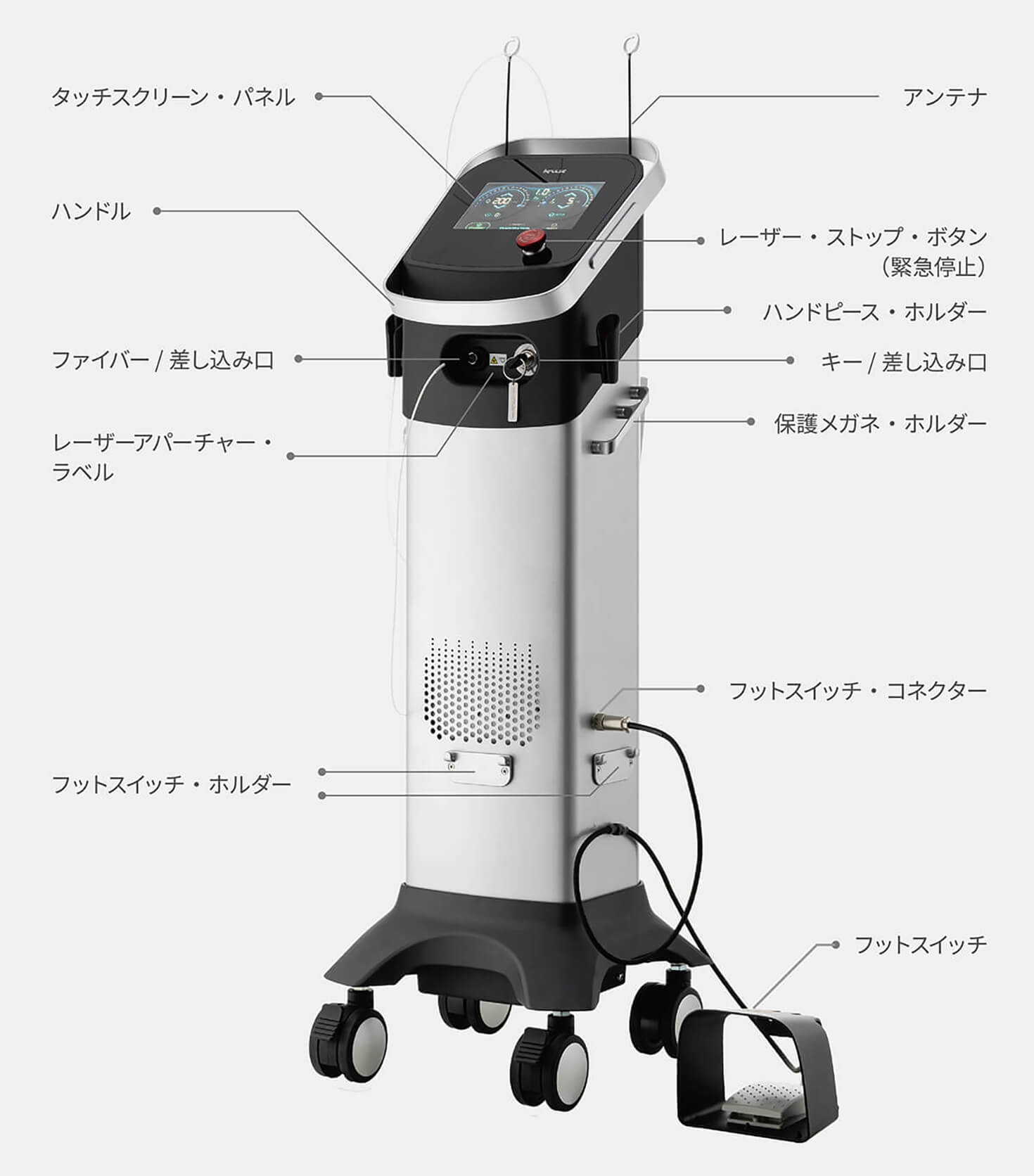 タイマー、出力調整などすべての操作をタッチパネルで行えます。メモリー機能も搭載で治療目的ごとに照射条件をセットしておくことも可能です。