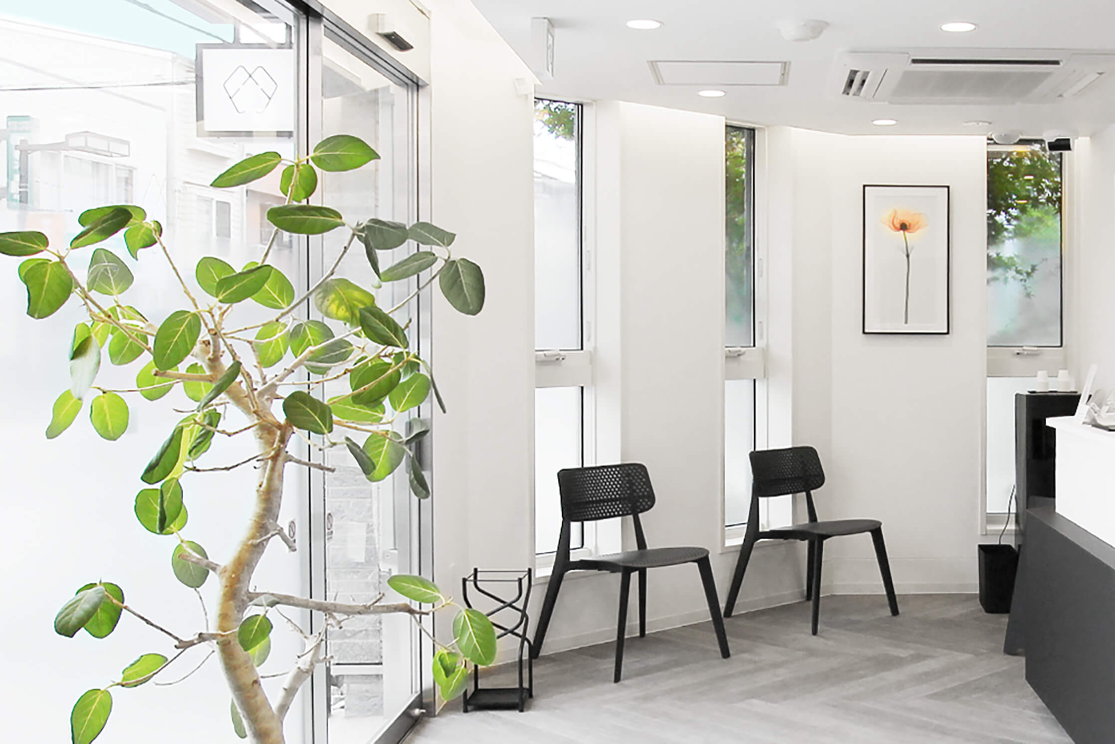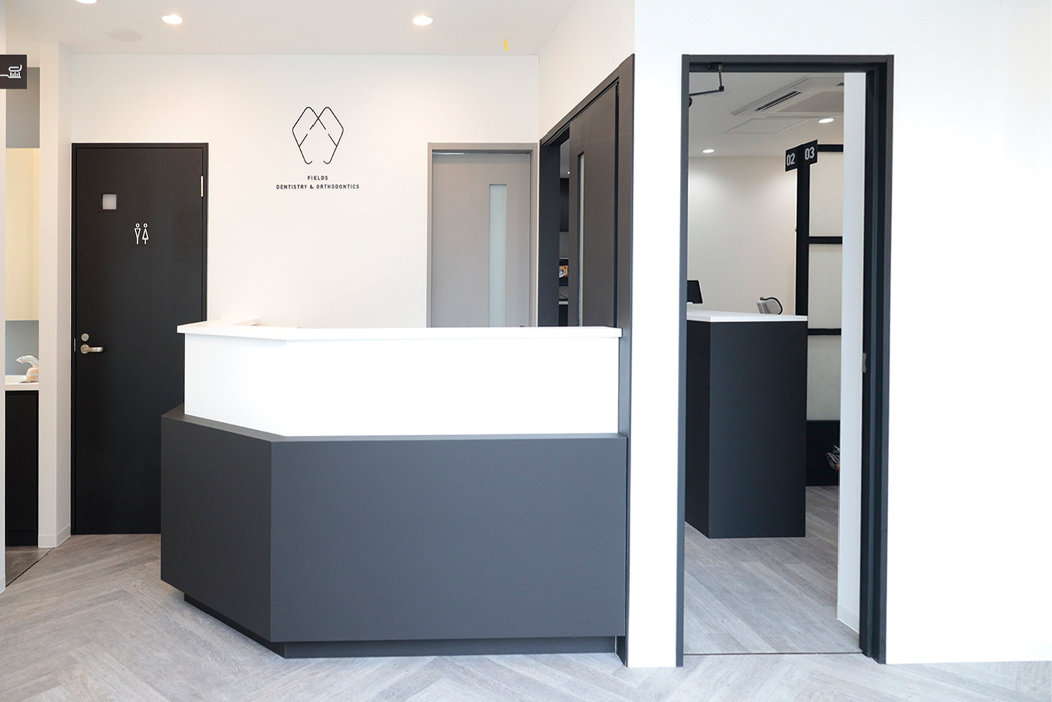 東京医科歯科大学で仲の良い同級生だった今村俊博先生と上津原悟郎先生は、将来を話し合ううちに、お互いの専門を活かして連携する歯科医院の開業を決意しました。クリニックは、駅から徒歩2分のマンションの1階にあり、「あらゆる患者さんに精度の高い治療を提供する」がコンセプトです。内装は、シンプルで歯科医院のイメージを変えるようなデザインに。清潔感のある白を基調に黒をアクセントカラーにしたモノトーンで統一し、ロゴや歯科医院名の書体も、スタイリッシュなデザインです。