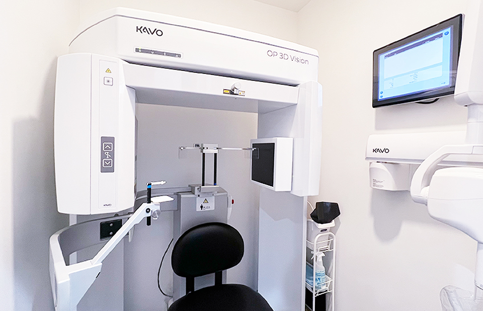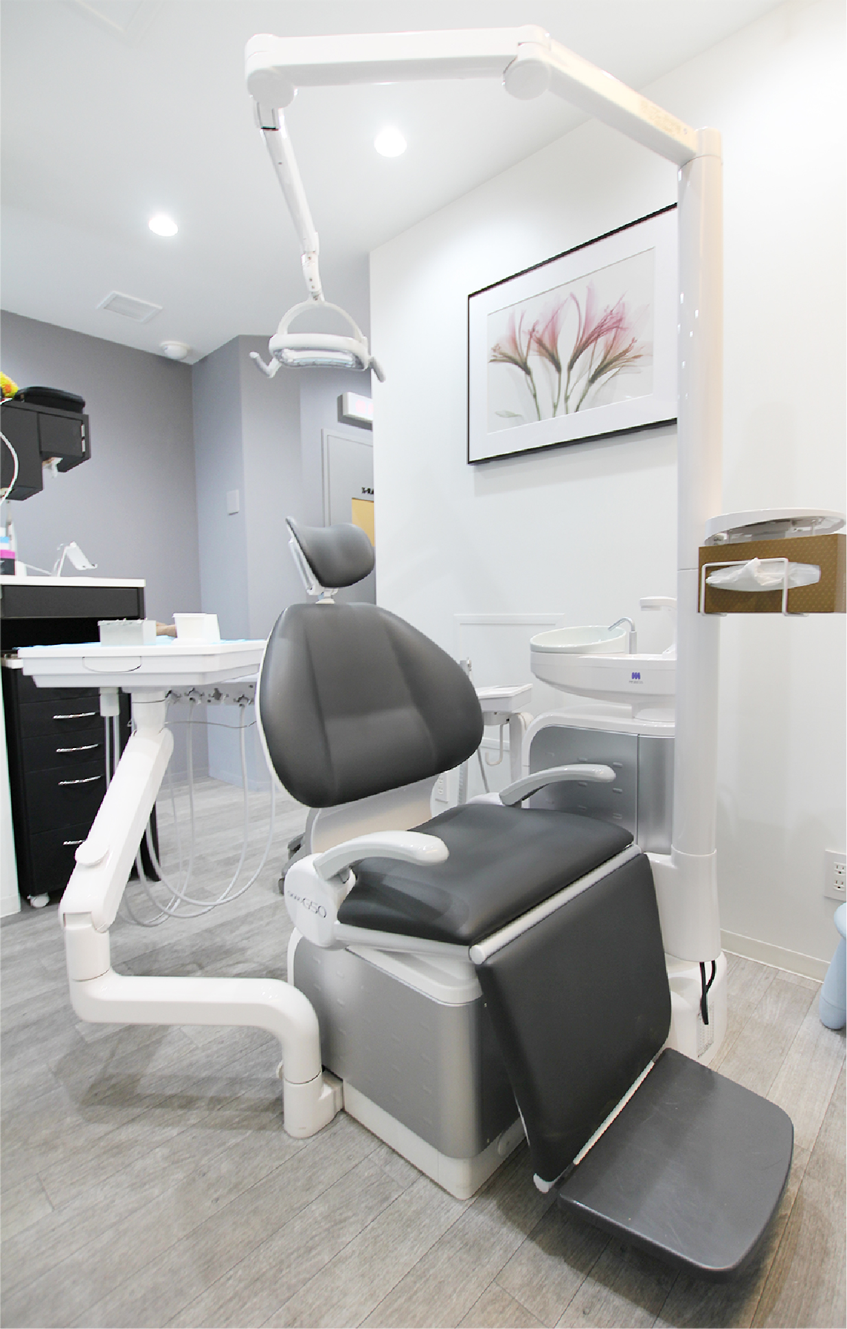 開業時、診療室は個室にユニットが1台、パーテーションで区切られた半個室にユニットが2台、2024年に新たに個室が増設されています。奥の個室は上津原先生、半個室の1台は今村先生、もう1台は歯科衛生士、新増設された個室は共用しています。KaVoのユニットがある個室はオペ室を兼ね、マイクロスコープや口腔内スキャナーも設置されています。